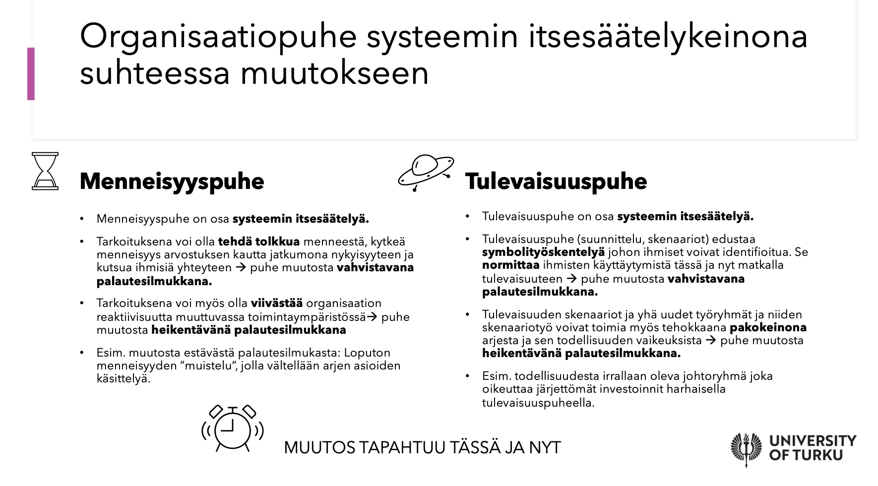 Harvemmin tulemme ajatelleeksi, että sekä menneisyys- että tulevaisuuspuhe voivat kumpikin toimia systeemin oppimista ja muutosta heikentävinä palautelinkkeinä. Tällöin siis sekä menneessä jumittaminen että tulevaisuuteen kiitäminen voivatkin tosiasiallisesti heikentää organisaation reagointikykyä ja oppimista suhteessa tavoiteltuun organisaation elinvoimaa ylläpitävään muutokseen.