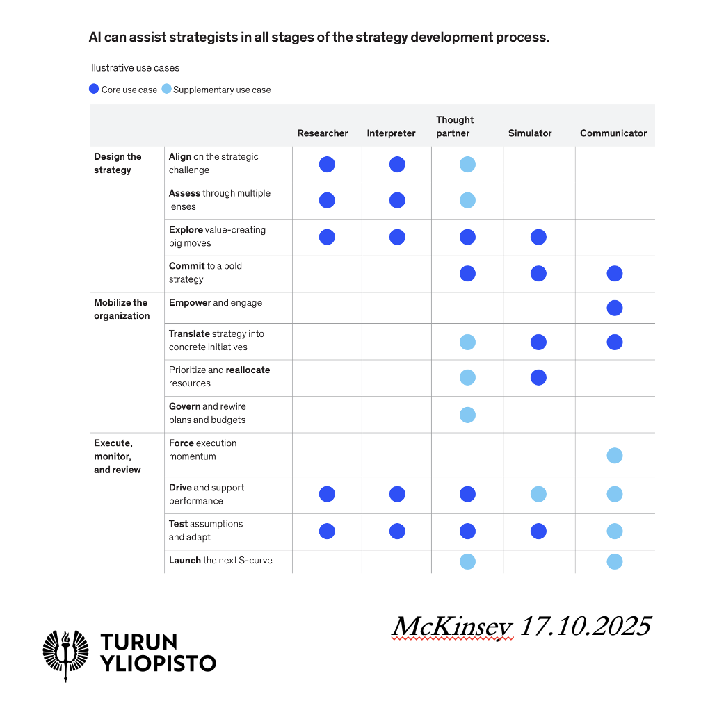 McKinsey on tuonut esille tekoälyn mahdollisia rooleja strategiatyössä (ks. oheinen kuva) mutta itse varoisin käyttämästä "rooli-käsitettä" tekoälyyn liittyen, sillä ryhmätutkimuksessa rooleilla viitataan ihmisten omaamiin rooleihin. Ja en näe, että tekoälyn inhimillistäminen on millään muotoa kestävä teko ihmiskunnan hyvinvoinnin näkökulmasta. Näin ollen tekoälyn inhimillistämisessä myös puheen tasolla tullee olla varovainen, sillä se on pelkkä teknologinen sovellus.